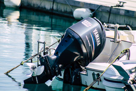 Limassol Cyprus March 24, 2020 Closeup of a motor of a boat moored in the marina of Limassol in Cyprus island