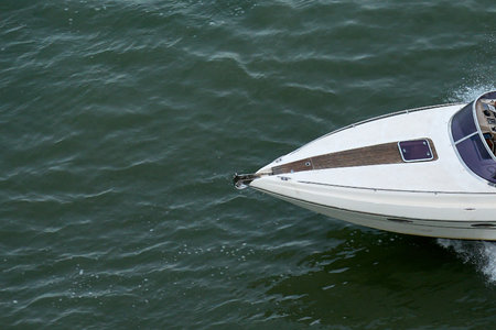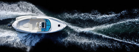 An aerial perspective showcases a motorboat navigating dark water, generating a textured foamy wake. The boat's sleek design contrasts with the churning white water. This image could be used for illustrating concepts related to water travel, transportation, or leisure activities, with potential uses in commercial or editorial contexts.