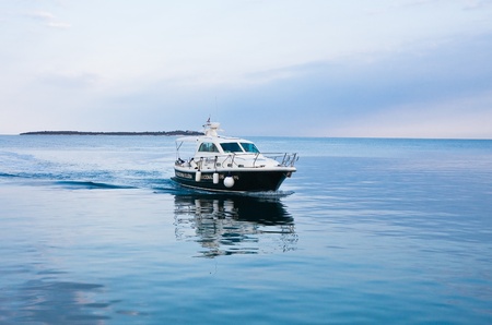A boat in the sea races on the water, leaving a trail of foam on the water