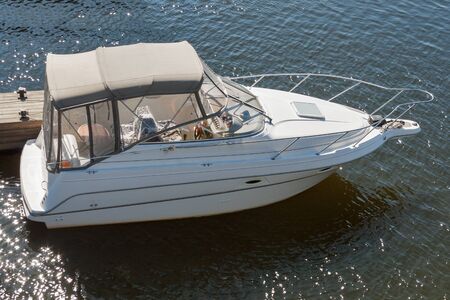 Luxury boat moored on a sunny day, view from above. Wooden pier at river with rope and mooring post.