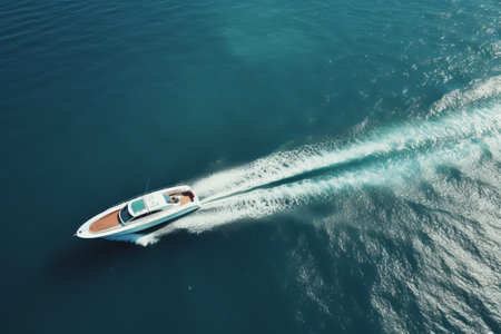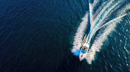 Aerial view of a speeding boat creating white trails in sparkling blue water, perfect for themes of adventure, leisure, and summer travel.