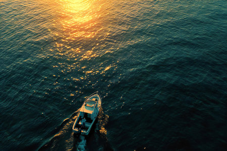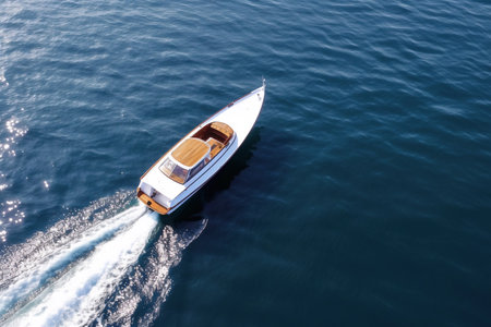 Captivating Aerial Shot: Motor Boat Serenely Cruising the Vast Open Sea