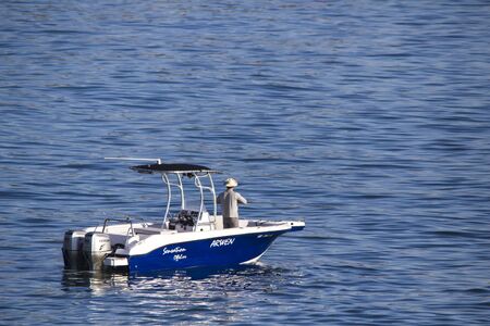 New Bedford, Massachusetts, USA - June 17, 2019: Center console boat cruising toward New Bedford with fishing boat in Buzzards Bay in background