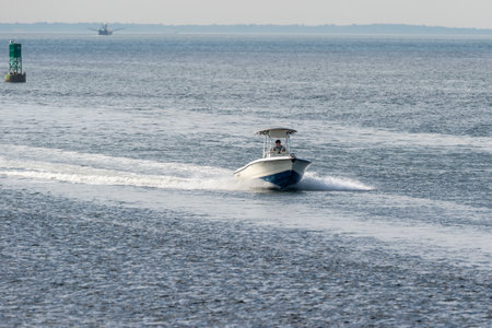 New Bedford, Massachusetts, USA - March 28, 2020: Powerboat heading for Buzzards Bay on hazy morning in early spring