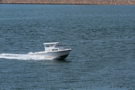 New Bedford, Massachusetts, USA - June 14, 2019: Small cabin cruiser heading into New Bedford