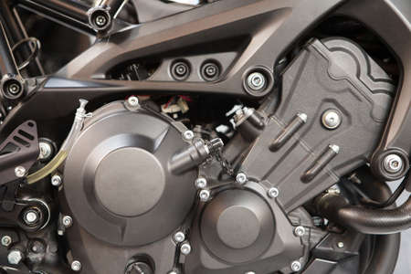 central part of black engine of motorcycle in horizontal. Many elements for background.