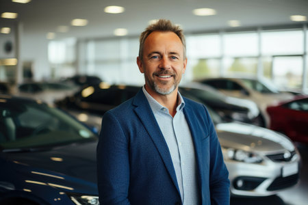 Front view of handsome man standing in modern car center and posing. Bearded manager wearing in dark blue jacket smiling and looking at camera. Row of automobiles on background.
