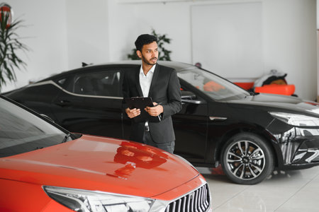 Successful indian businessman in a car dealership - sale of vehicles to customers