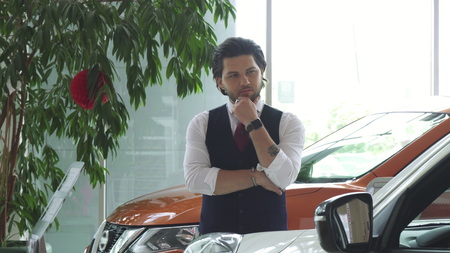 Handsome bearded young man looking thoughtfully at the new car at the dealership salon. Attractive businessman choosing an automobile to buy. Transport, consumerism, rental service.