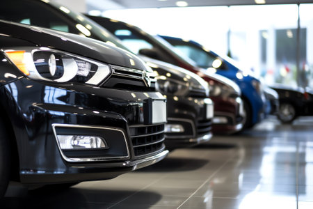 Close-up photo of shiny car and another one in blurred background standing in bright car rental interior