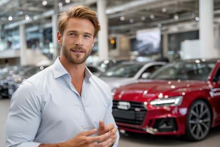 a luxury car dealership showroom salesman talk with potential buyers in background AI generated