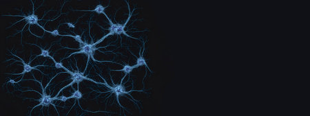 This stock illustration features a mesmerizing abstract visualization of microscopic neuron fractals with blue light particles, created using generative AI technology.
