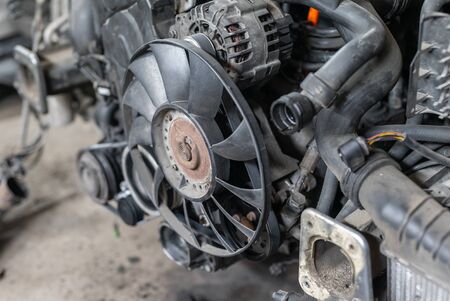 Close Up of dismantled car engine in a car workshop