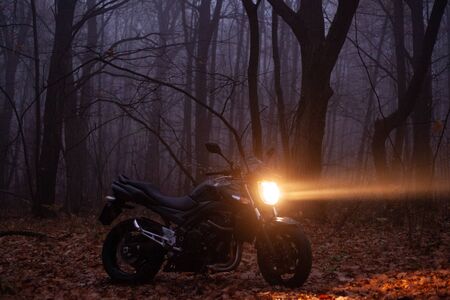 Motorcycle parked on the street at night. Close-up.