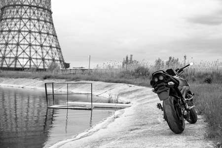 Sports black motorcycle near the power plant.