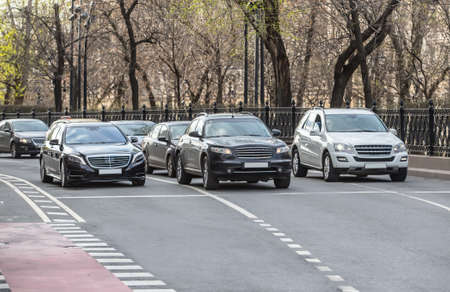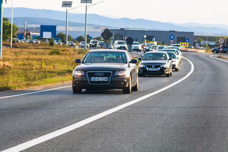 Traveling cars in motion on asphalt road, front view of cars in row on street. Bucharest, Romania, 2020
