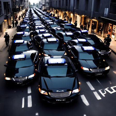 In a bustling city intersection, police vehicles with flashing lights navigate through a rainy night, creating a vibrant display against wet pavement. The reflections add to the dynamic atmosphere.