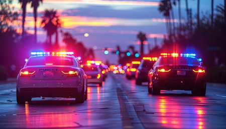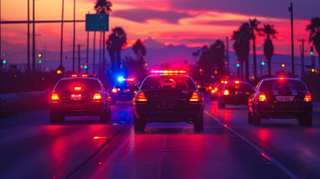 Dynamic scene of police vehicles speeding down a highway during sunset, showcasing vibrant lights against a colorful sky, emphasizing urgency and law enforcement activity.