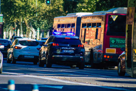Seville Spain July 01, 2021 Police car rolling in the streets of Seville, an emblematic city and the capital of the region of Andalusia, in the south of Spain
