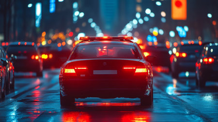 City Streets, Night Patrol Police Car Navigates City Traffic with Flashing Emergency Lights.