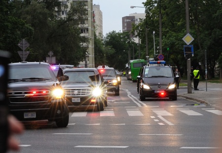 Warsaw, Poland - May 27, 2011 - Presidential motorcade transporting U.S. President Barack Obama in Warsaw streets.