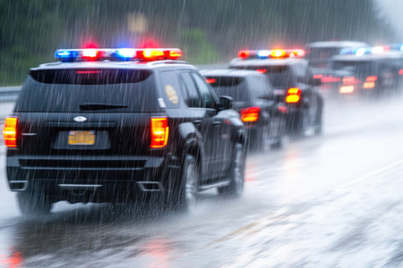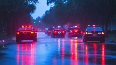 Police cars driving on highway in heavy rain with flashing lights during dangerous weather conditions