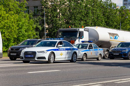 A police car (written in Russian) on the street in city (summer sunny day). Moscow, Russia