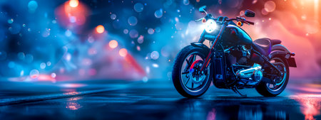 High power motorcycle chopper. Fog with backlights on background with man rider at night. Empty space. Selective focus