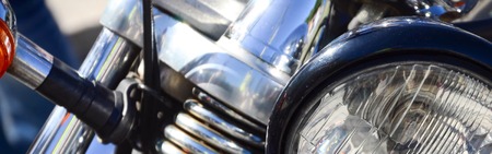 Close up fragment of chromed shiny lamp of old classic motorbike