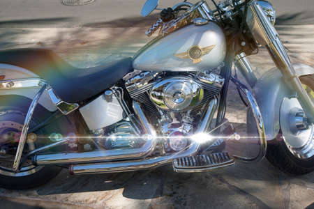 Kyiv, Ukraine - April 4th, 2017: Photo of Harley davidson motorcycle in sunset reys