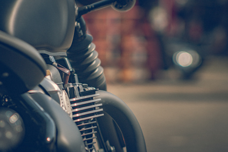 Motorbike with shining parts, close up. Motorcycle engine, toned
