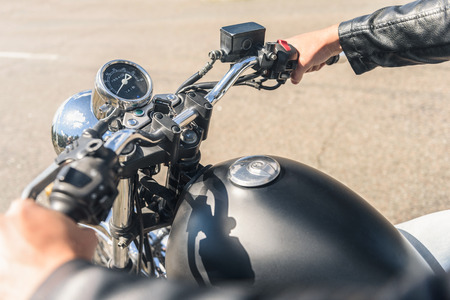 Hand Of A Biker Laying On Motorcycle Steering. Going For Ride. Speed Vehicle. Motorbike Concept. Tripping Together. Speed Choosing. Journey Start. Ready To Go. Power Button. Black Jacket.