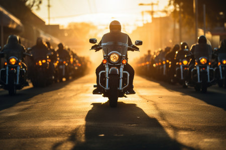 A convoy of bikers rides into the sunset, enveloped in a fiery haze, lights glowing on an open road.