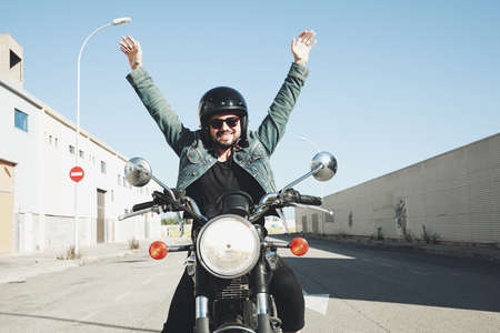 Happy bearded biker staying with unknown big chopper bike on road with hands up.