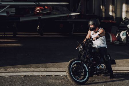 Cropped photo of Caucasian motorcyclist in leather clothes having rest in garage stock photo