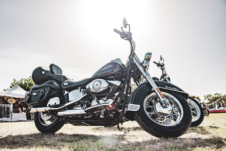 Kyiv, Ukraine - April 4th, 2017: Photo of Harley davidson motorcycle in sunset reys