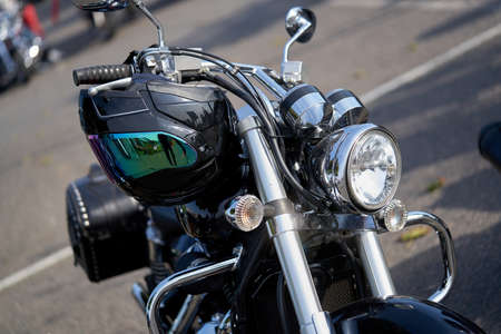 RIGA, LATVIA - APRIL 28, 2018: 2018 Moto Season Opening Event. A close-up of the most interesting details and attributes of motorcycles parked at the parade.