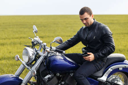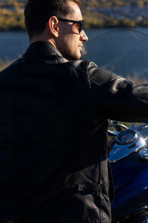 Young man wearing a black leather jacket, sunglasses and jeans sits outdoor on a motorcycle, resting on a mountain above the river. Lifestyle, travel. Copy space. Advertising and commercial design.