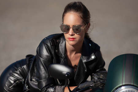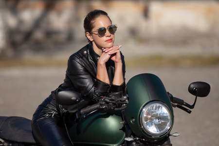 Portrait of confident motorcyclist woman in motorcycle helmet. Young driver biker looking away outdoors alone on highway. Ready for trip. Cafe racers, motorbike aesthetics and vintage design concept.