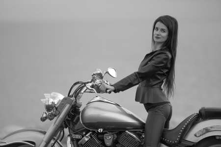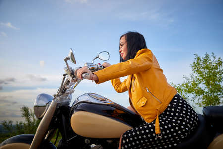 Attractive female brunette motorcyclist with motorcycle in a summer day. Beautiful girl with a bike. Adventure and travel concept