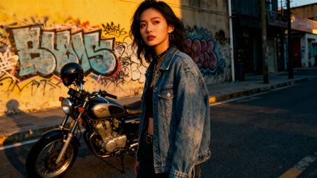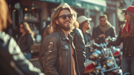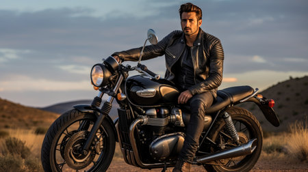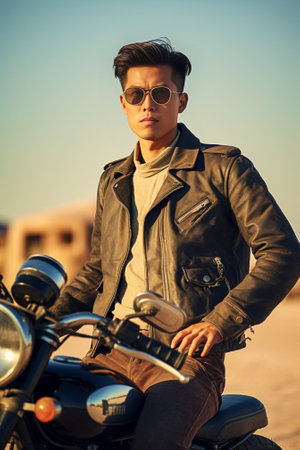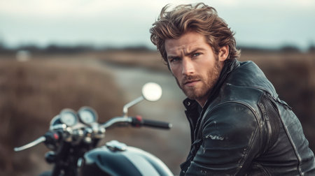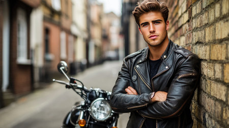 A young man leaning against a classic motorcycle, wearing a leather jacket and exuding a cool, rebellious attitude