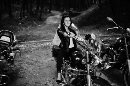 Ukraine, Tarnopol - September 8, 2018: Young woman at hen party on chopper and wear black leather dress. Biker Woman on motorcycle.