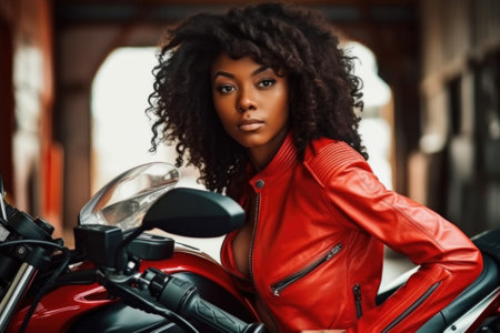 African american biker girl in a red leather jacket on a motorcycle. Generative AI.
