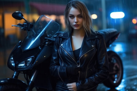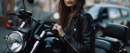 cropped view of woman in leather jacket sitting on motorcycle on street.generative ai