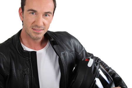 Young biker in a leather jacket pretending to ride a motorcycle isolated on a white background. Horizontal.
