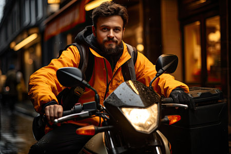 A rider on a motorcycle carrying a box on the back of the vehicle. Calling for food concept