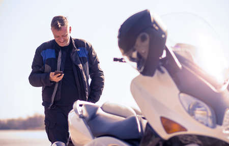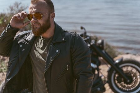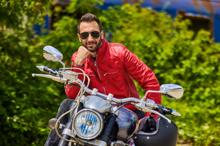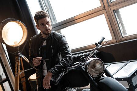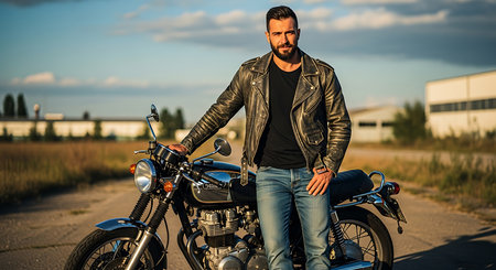 Portrait of a handsome man biker in a leather jacket and jeans standing next to his motorcycle.