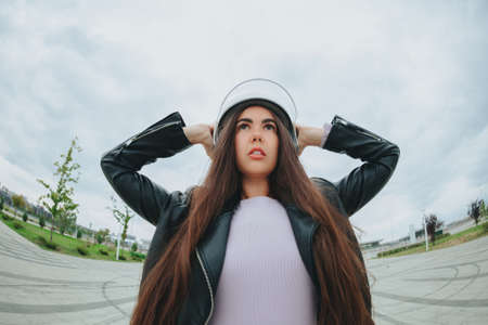 Young attractive woman biker wearing bike safety helmet while standing at empty stadium outdoors, beautiful female motorcyclist in dress and protective gear