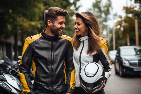 Young laughing couple wearing motorcycle gear and helmets, yellow and black colors, AI Generated
