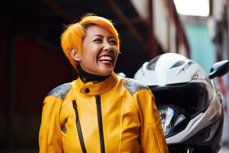 Young laughing woman with short bright hair wearing motorcycle gear and helmet, yellow and black colors, AI Generated